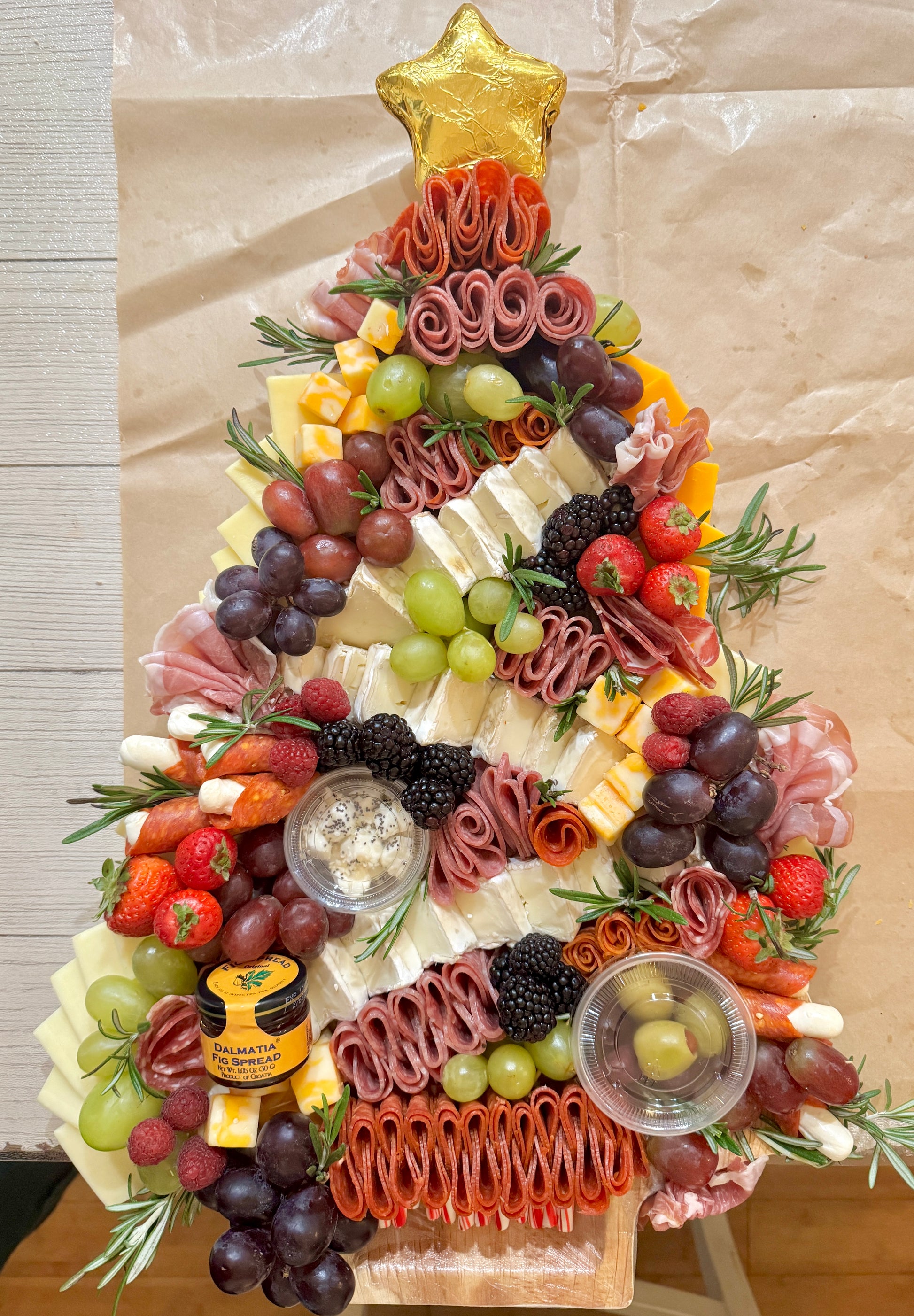 Celebrate the holidays with our Christmas Tree Charcuterie Board Bundle, one of our most popular seasonal offerings. This festive board is arranged on a large 19×13-inch palm-leaf tray shaped like a Christmas tree and includes a separate dry ingredient box.