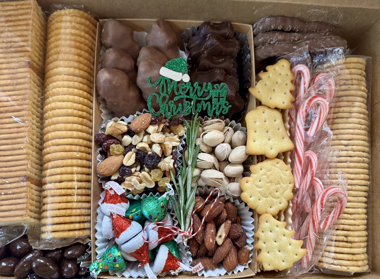 These boards feature Christmas-colored ingredients, holiday cookies, winter fruits, themed chocolates, candy canes, seasonal berries, decorative greenery, and optional personalized cheese lettering.