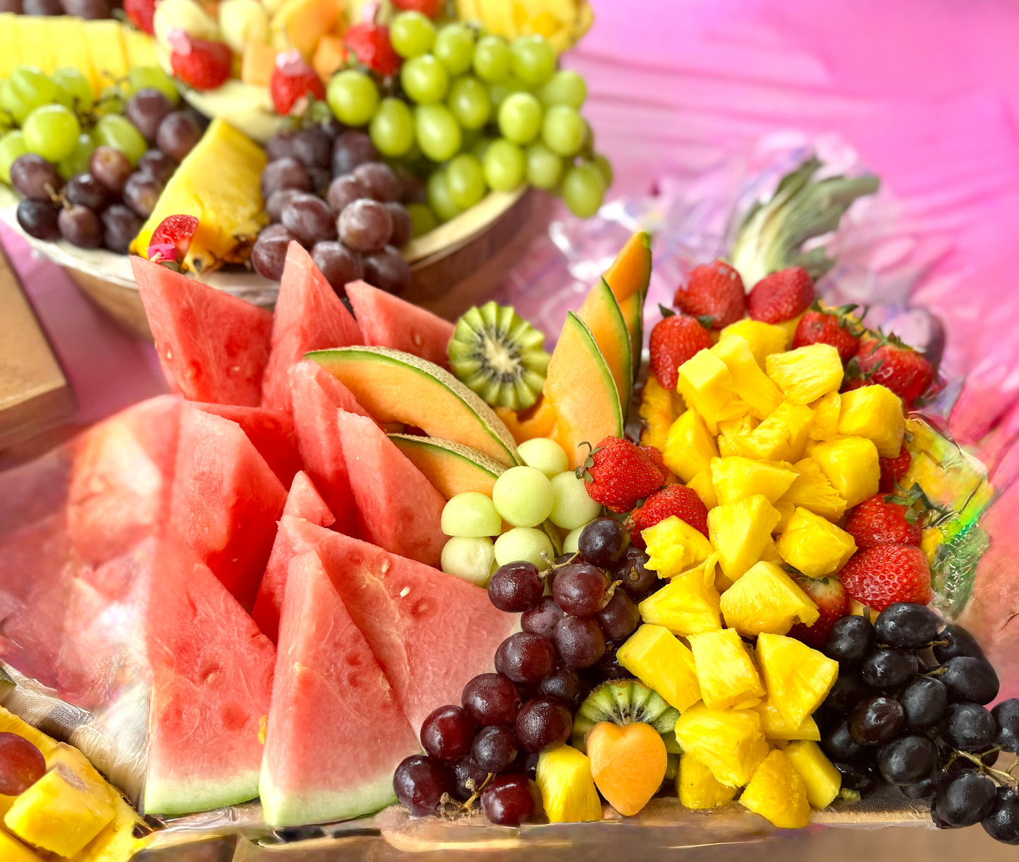 We use a rotating selection of fresh fruits including (but not limited to): watermelon, cantaloupe, honeydew, pineapple, kiwi, grapes, strawberries, blueberries, raspberries, blackberries, apples, oranges, dragon fruit, lychee, lilikoi, star fruit, and seasonal Hawaiian specialties when in season. Every platter is freshly prepared on the day of delivery.