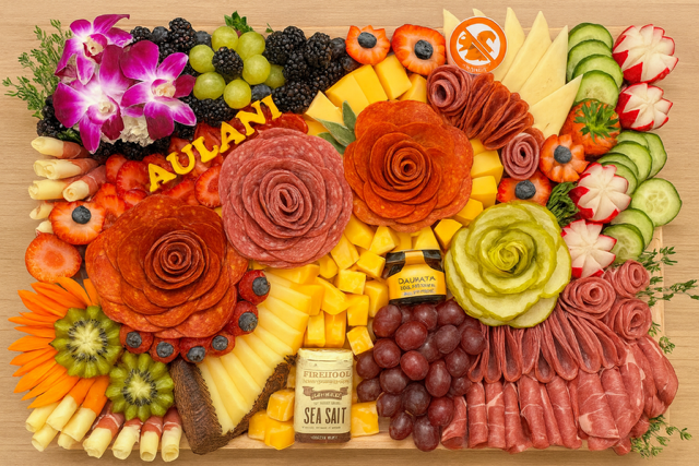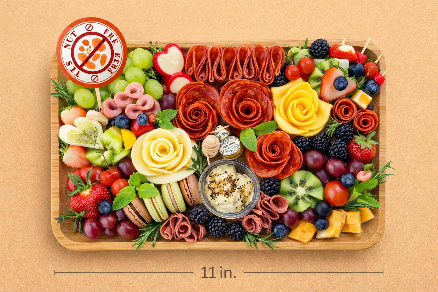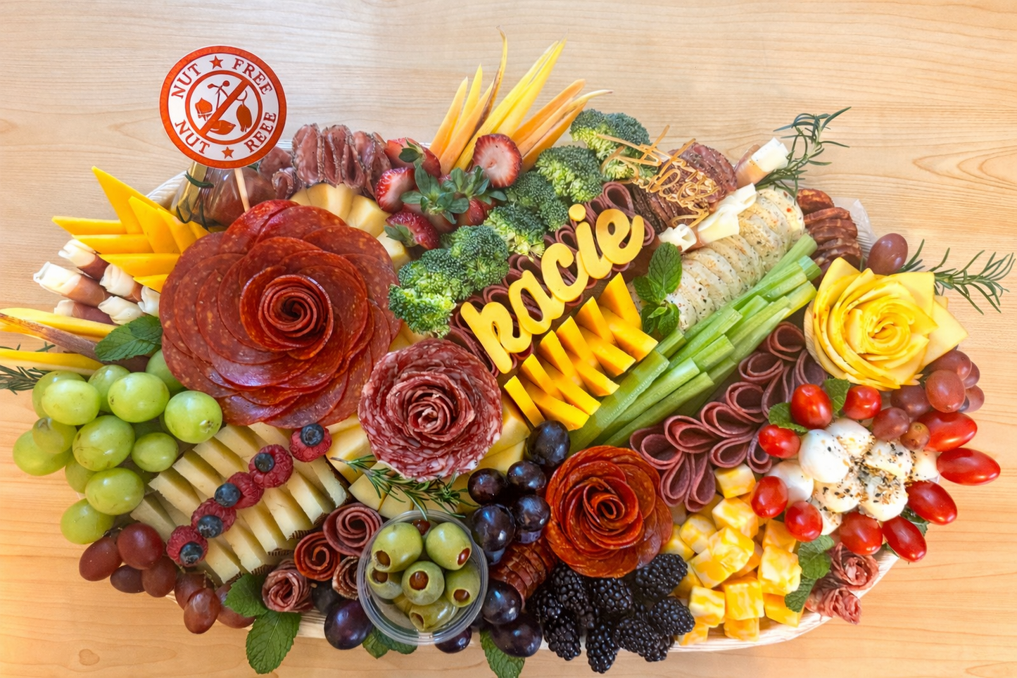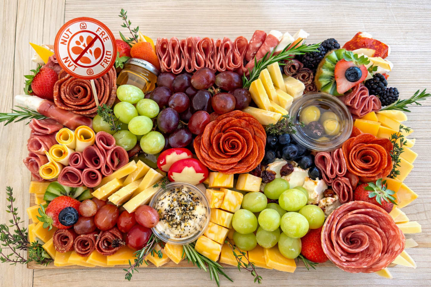 Prepared with careful attention to sourcing and handling, these boards feature a selection of premium cheeses, cured meats, fresh fruits, dips, spreads, vegetables, sweets, cookies, crackers, and seasonal accents — all verified nut-free.