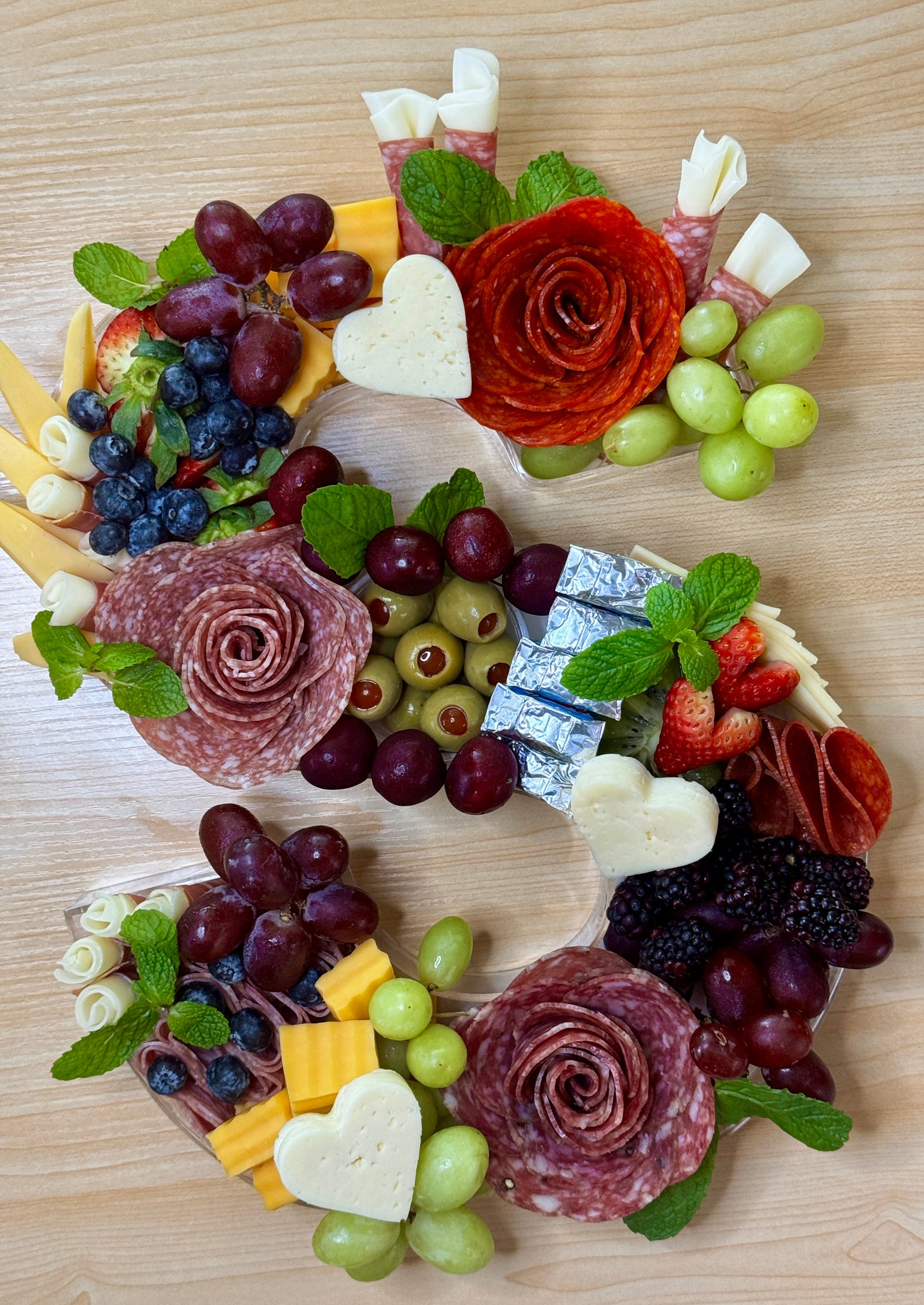 Each board is crafted in the shape of your chosen letter or number and arranged with premium meats, cheeses, fruits, chocolates, cookies, sweets, nuts, dips, spreads, and decorative accents. Boards are styled intentionally to highlight the shape while ensuring abundant, visually stunning presentation.